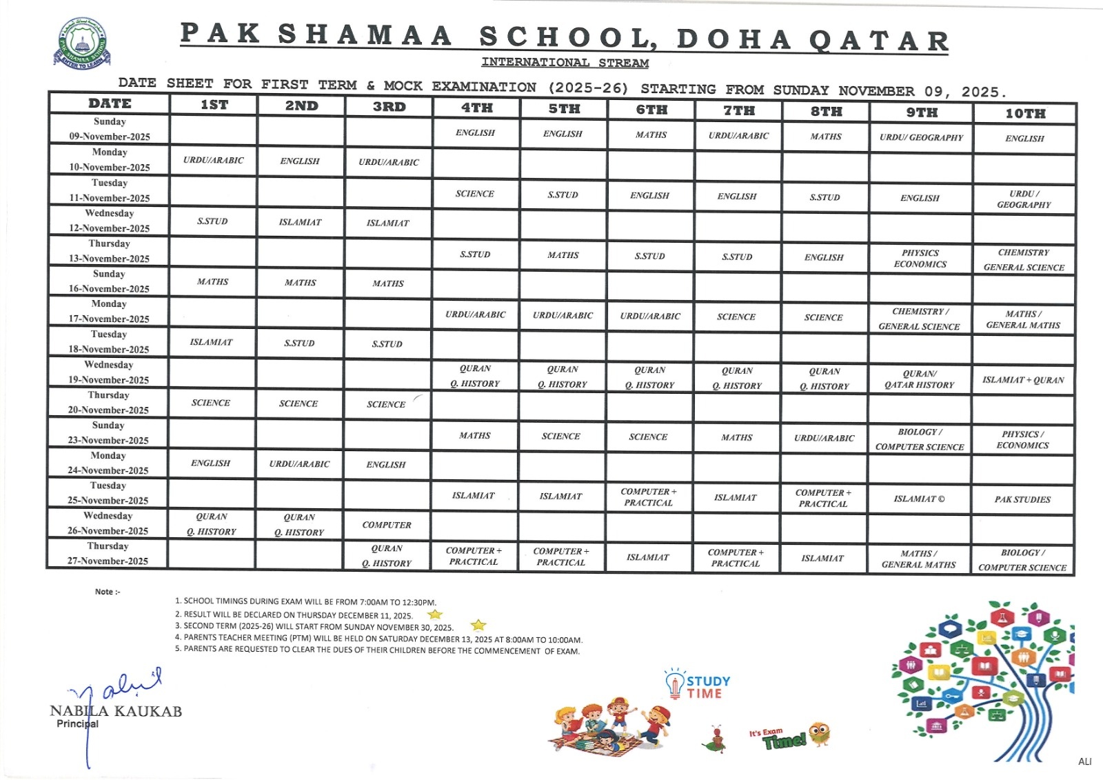 Date Sheet for First Term Exam (2025-26), International Stream